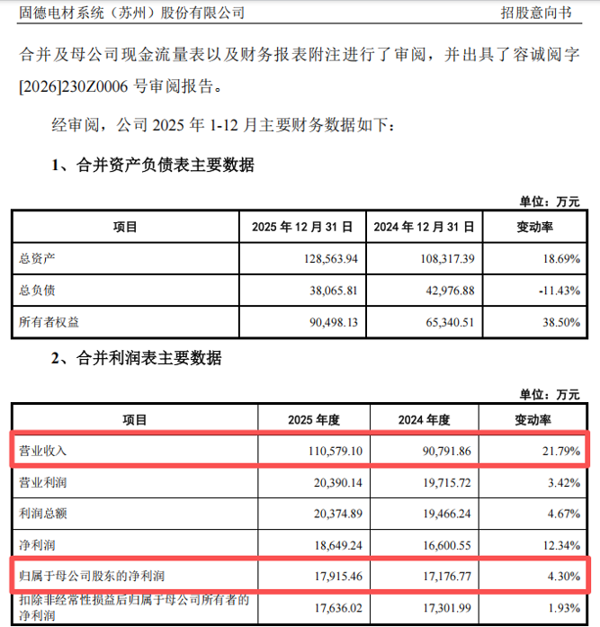 招股意向书显示,受益于行业对动力电池安全性的日益重视,以及发电、输配电项目建设投资增速提升等因素,固德电材预计其2025年全年的营业收入为11.06亿元,同比增长21.79%;归母净利润为1.79亿元,同比增长4.30%。