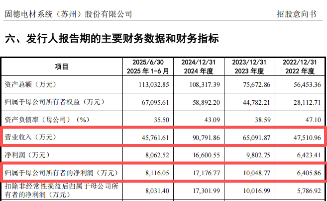 2022年至2024年及2025年上半年,固德电材的营业收入分别为4.75亿元、6.51亿元、9.08亿元及4.58亿元,归母净利润分别为6405.86万元、1.00亿元、1.72亿元及8116.05万元。