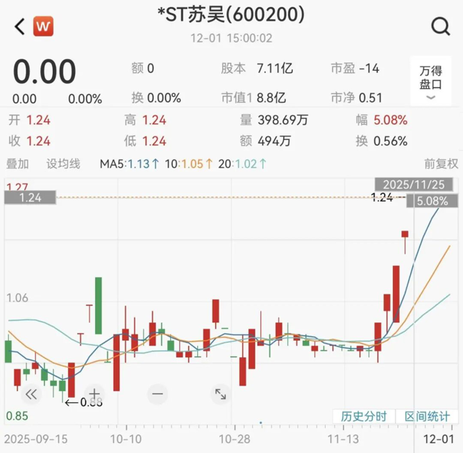 停牌前,*ST苏吴曾实现5连板。截至11月25日收盘,该股报1.24元/股,总市值为8.8亿元。