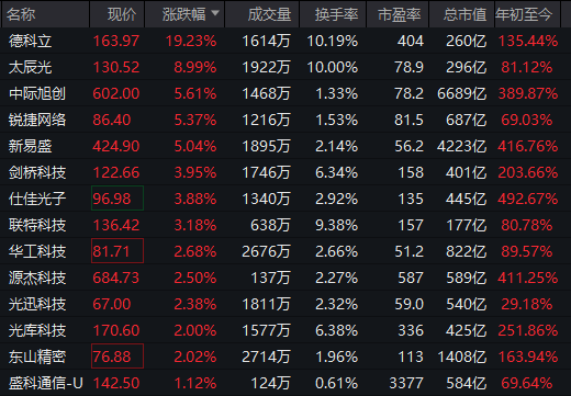 CPO概念早盘再度走强,德科立涨超19%,太辰光、中际旭创、锐捷网络等涨幅居前。