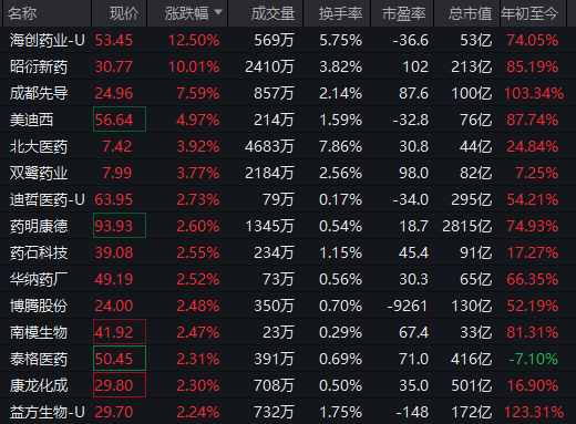 创新药概念股表现活跃,海创药业涨超12%,昭衍新药涨停,成都先导、美迪西、北大医药等跟涨。
