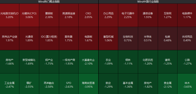 板块上来看,创新药概念股表现活跃,CPO、电子元器件、互联网等板块涨幅居前;而贵金属、海南自贸港、房地产等震荡调整。