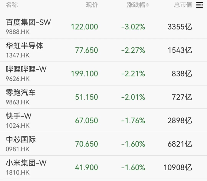港股方面,三大指数悉数下跌,百度集团、华虹半导体、哔哩哔哩跌幅居前。