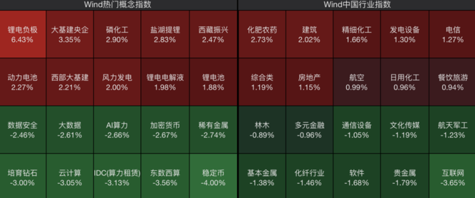 板块上来看,化工板块强势走高,电力、房地产、锂电等板块表现活跃;而AI应用方向整体走低,贵金属、航天军工、稳定币等板块震荡调整。