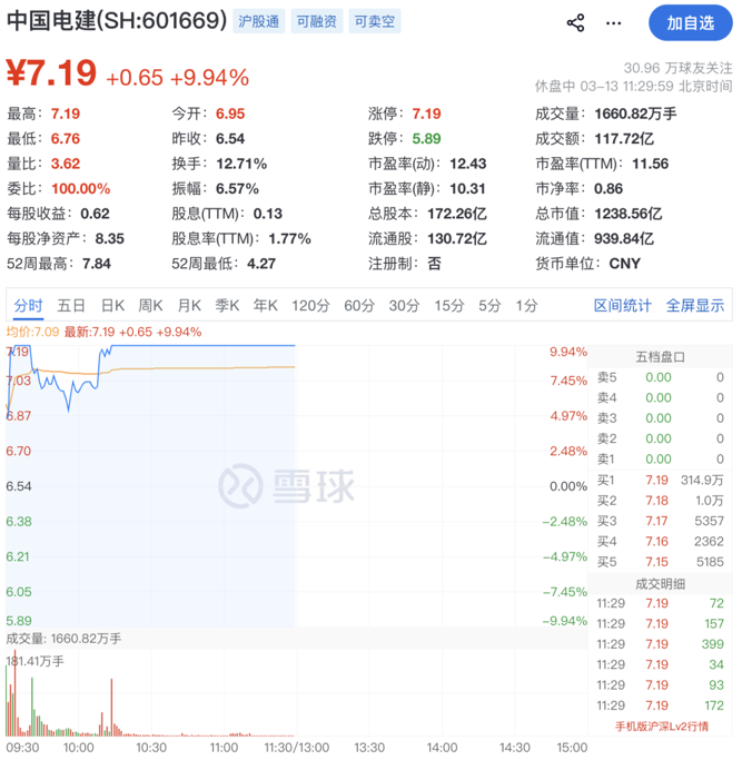 此外,“千亿巨头”中国电建315万手封涨停,总市值为1239亿元。