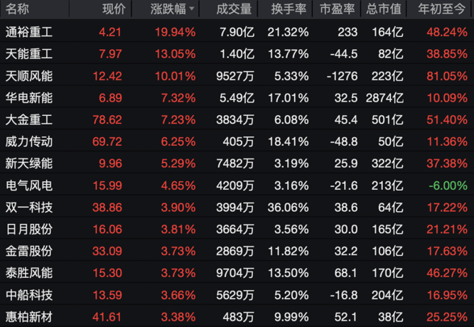 电力股震荡拉升,通裕重工实现20%涨停,天能重工涨逾13%,天顺风能涨停。
