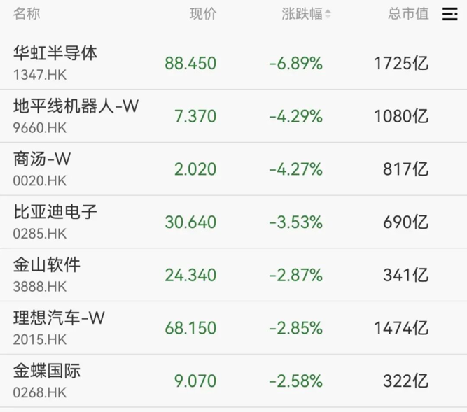 港股市场冲高回落,华虹半导体、地平线机器人、商汤等均跌超4%。
