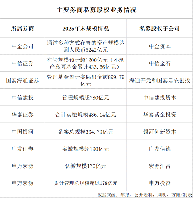从管理规模来看,中金公司私募股权投资规模明显领先,中金公司自己的表述为“市场龙头地位进一步巩固”。中金公司在2025年年报中表示,截至2025年12月31日,公司私募股权业务通过多种方式在管的资产规模达5242亿元,这一数据较前一年的4576亿元增长15%。而其他券商私募股权业务基本在千亿元或以下的规模水平。