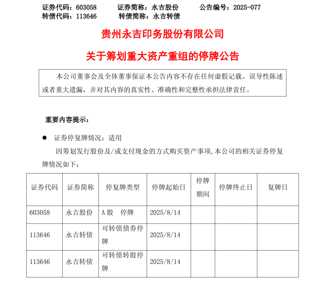 为保证公平信息披露,维护投资者利益,永吉股份股票、可转债及可转债转股自2025年8月14日起停牌,预计停牌时间不超过10个交易日。