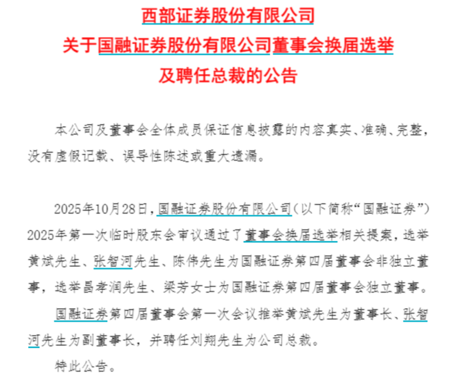 近日,西部证券发布公告称,国融证券第四届董事会第一次会议推举黄斌为董事长、张智河为副董事长,并聘任刘翔为公司总裁。