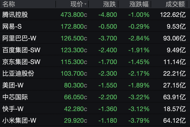 大型科技股集体低迷,小米尾盘下跌,收跌近4%,阿里巴巴跌近3%,百度、美团跌近2%,京东下跌1.45%,腾讯下跌1%。