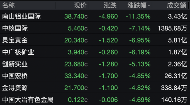 南山铝业国际跌超10%,中核国际、灵宝黄金、中广核矿业等跌超6%。