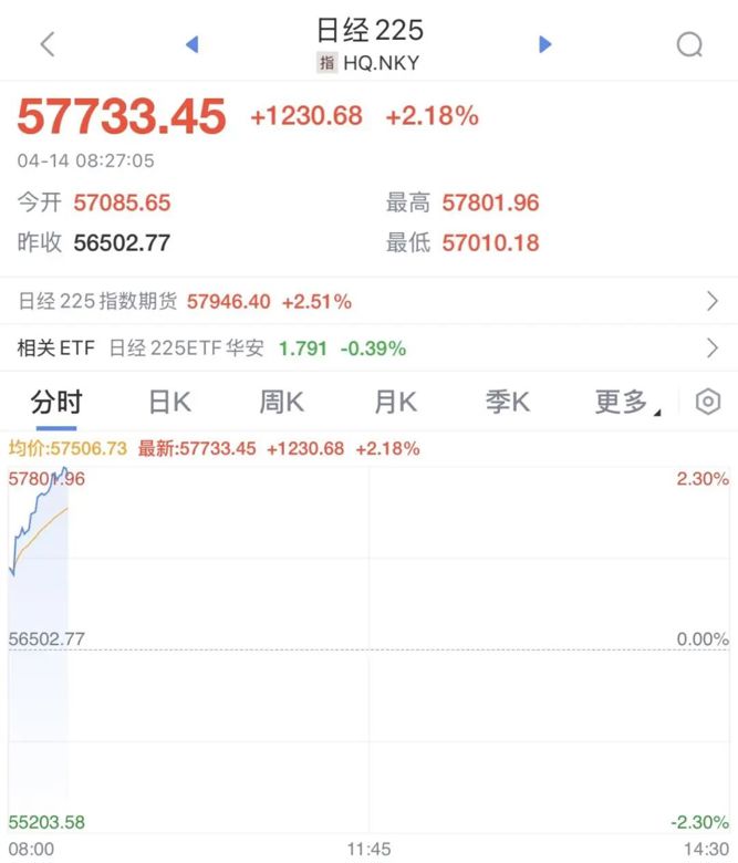 此外,受芯片股带动,日经225指数涨幅扩大至2%,最新报57733.45点。