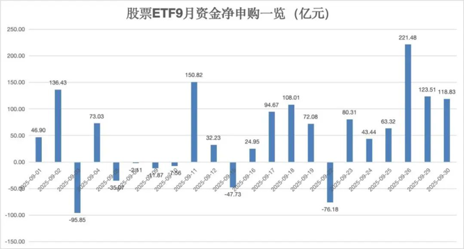 9月最后一个交易日,股票ETF市场再现百亿元资金净流入,推动当月股票ETF资金净流入突破千亿元大关。