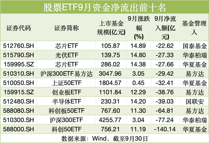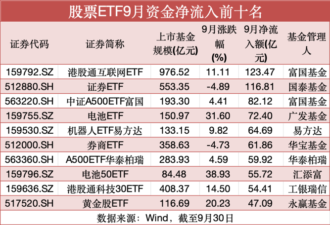 9月份超千亿元资金涌入股票ETF市场,单只产品也出现较为可观的资金净流入,部分股票ETF资金净流入超过百亿元。