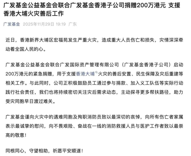 11月29日,广发基金发布消息称,广发基金公益基金会联合广发国际资产管理有限公司(广发基金香港子公司)启动200万港元的紧急捐赠,用于支援香港大埔火灾的善后安置、民生保障及灾后重建等相关工作。与此同时,公司正积极鼓励员工通过参与捐款、加入义工队伍等实际行动践行社会责任,也将持续密切关注灾后需求动态,主动探寻更多帮扶路径,助力受灾同胞早日渡过难关。