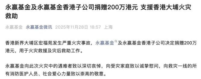 永赢基金称,香港新界大埔区宏福苑发生严重火灾事故,永赢基金及永赢基金香港子公司决定捐赠200万港元,用于火灾救援及灾后救助工作。