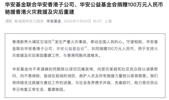 华安基金表示,华安基金联合华安香港子公司、华安公益基金会捐赠100万元人民币驰援香港火灾救援及灾后重建,与香港同胞共渡难关。