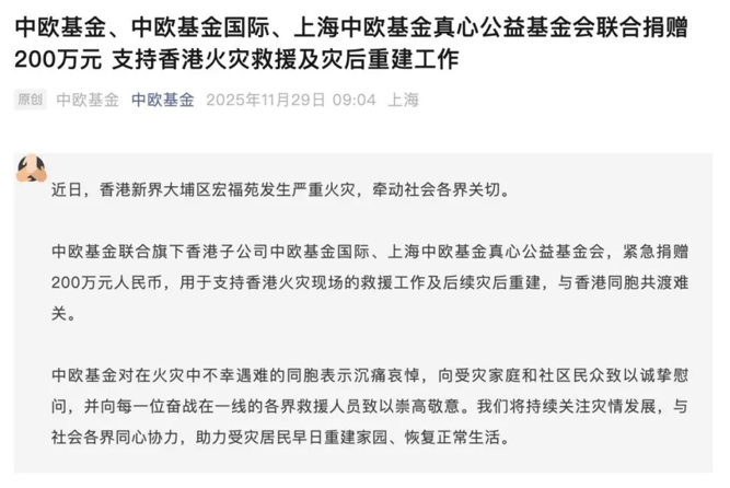 中欧基金表示,中欧基金联合旗下香港子公司中欧基金国际、上海中欧基金真心公益基金会,紧急捐赠200万元人民币,用于支持香港火灾现场的救援工作及后续灾后重建,与香港同胞共渡难关。11月27日,中欧基金国际刚以公司名义捐赠了10万港元。