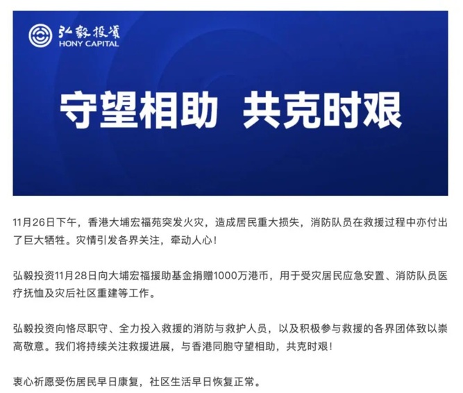 弘毅投资11月28日向大埔宏福援助基金捐赠1000万港元,用于受灾居民应急安置、消防队员医疗抚恤及灾后社区重建等工作。