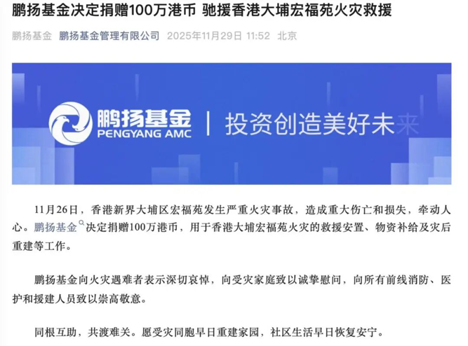 面对此次严重火灾事故,鹏扬基金决定捐赠100万港元,用于香港大埔宏福苑火灾的救援安置、物资补给及灾后重建等工作。