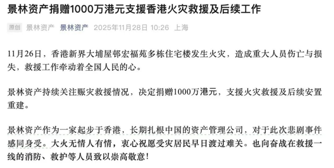 11月28日,景林资产表示,景林资产持续关注赈灾救援情况,决定捐赠1000万港元,支援火灾救援及后续安置重建。