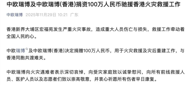 中欧瑞博及中欧瑞博(香港)决定捐赠100万元人民币,用于火灾救援及灾后重建工作,与香港同胞共渡难关。