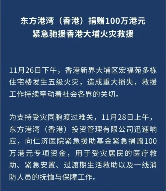 为支持受灾同胞渡过难关,11月28日上午,东方港湾(香港)投资管理有限公司迅速响应,向仁济医院紧急援助基金紧急捐赠100万港元专项资金,用于受灾居民的医疗救助、紧急安置、过渡期生活救助以及一线消防人员的抚恤与保障工作。