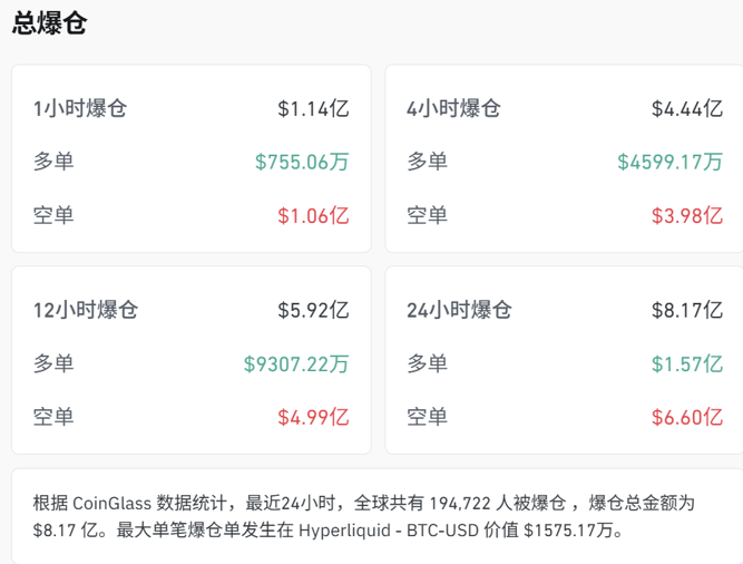 CoinGlass数据显示,最近24小时,全球共有194722人被爆仓,爆仓总金额为8.17亿美元,其中,空单多达6.6亿美元。