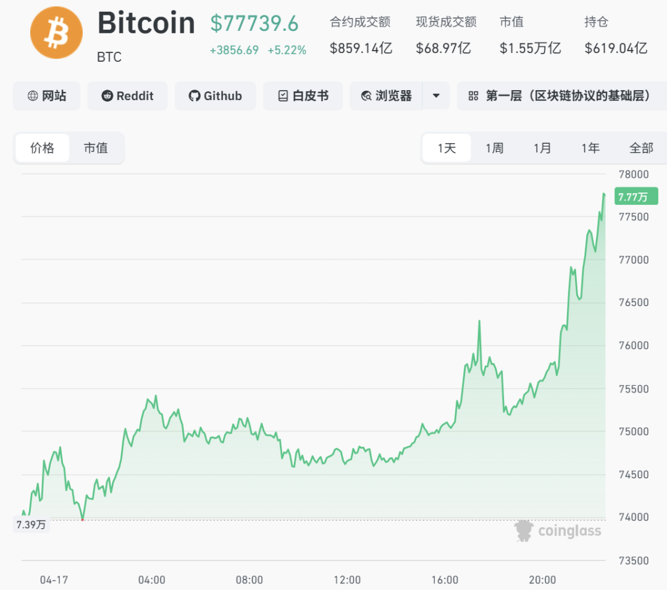 比特币直线飙涨,截至发稿突破77700美元,涨至两个多月以来新高。
