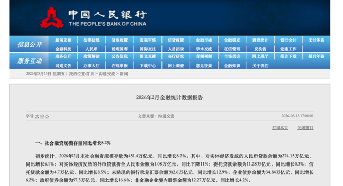 3月13日,央行最新金融统计数据报告显示,2月金融总量较快增长、社会融资条件保持宽松;信贷总量平稳增长、投放节奏更趋均衡。