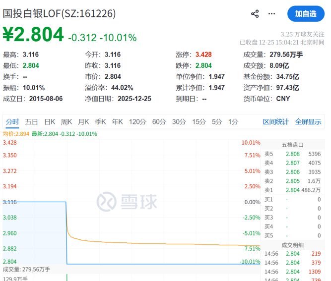 另外,国投白银LOF发布公告称,将于26日开盘起至10:30停牌后复牌,并警示二级市场交易价格存在明显溢价风险。截至12月25日,该基金二级市场收盘价为2.804元,较12月24日的基金份额单位净值1.9278元高出45%。