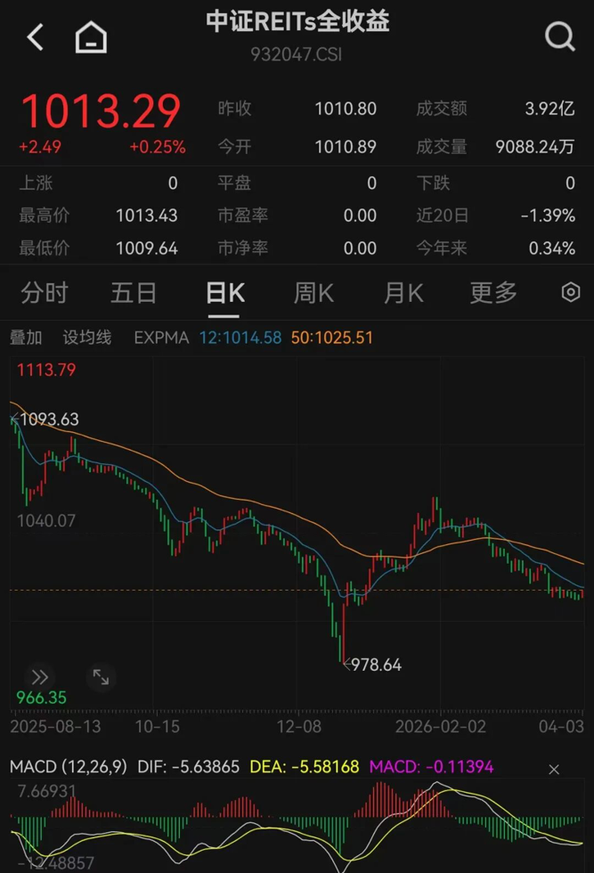 中证REITs全收益指数周跌幅0.01%
