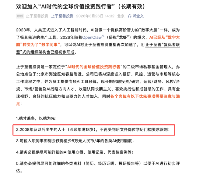 事实上,止于至善投资的这则招聘此前曾引发更大争议——最初的版本将年龄门槛设为16岁,高中学历即可应聘,一度在资管行业引发广泛讨论。