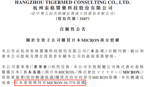 【导读】泰格医药自愿披露子公司收购日本MICRON 56.37%股权