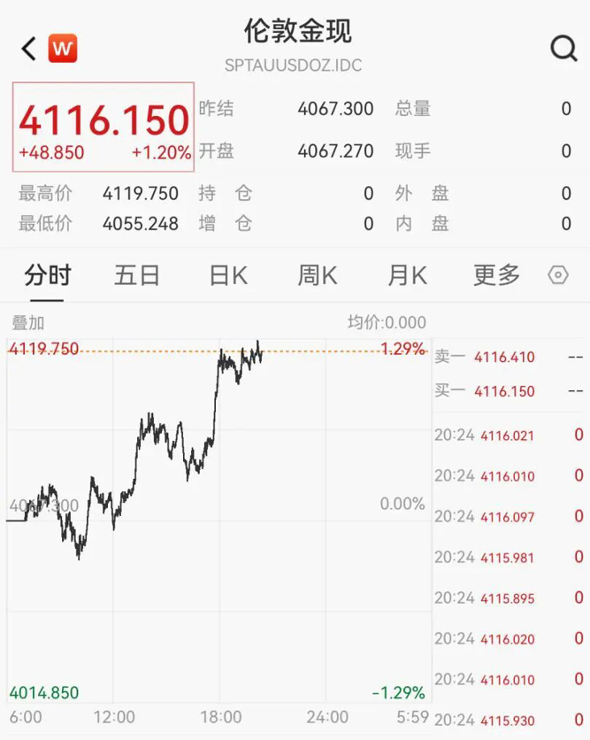 截至记者发稿,现货黄金报4116.15美元/盎司,日内大涨1.2%。