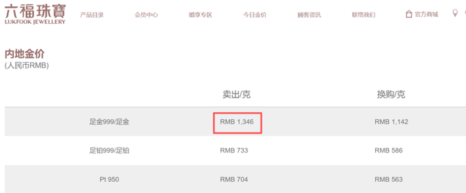 周大福金饰价格为1348元/克,六福珠宝为1346元/克,