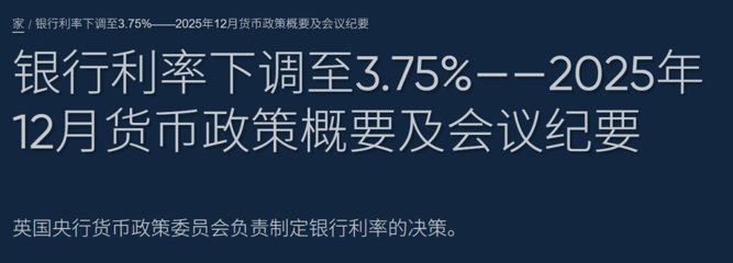 英国央行货币政策委员会(MPC)周四公布的会议纪要显示,委员会以5票赞成、4票反对的结果,决定将基准利率下调25个基点至3.75%。这是自8月以来的首次降息——这个由9名成员组成的委员会在过去两次利率决议中都按兵不动。