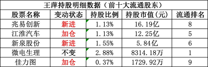 与2025年三季度末相比,王萍对微电生理持股不变,对江淮汽车、佳力图均有一定加仓。