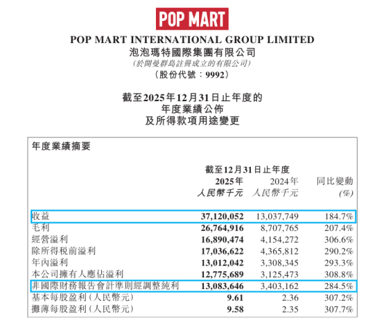 根据泡泡玛特2025年财报,公司实现营收371.2亿元,同比增长184.7%;经调整净利润130.8亿元,同比增长284.5%。