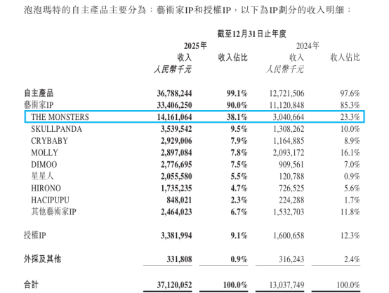 最后则是收入结构问题凸显。以LABUBU为核心的THE MONSTERS系列产品,在2025年实现营收141.6亿元,占总营收的比重从2024年的23.3%大幅提升至38.1%。尽管公司拥有17个营收过亿元的IP,但头部IP的收入集中度不降反升。