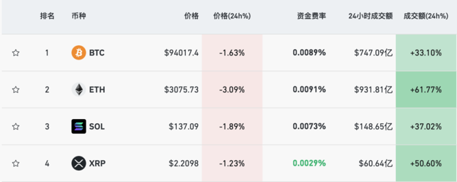 以太坊跌3.09%,Solana跌1.89%,XRP跌1.23%。