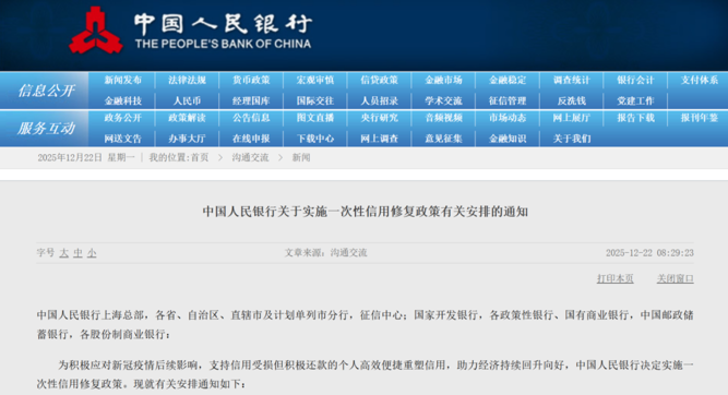 12月22日,央行官网发布《关于实施一次性信用修复政策有关安排的通知》。