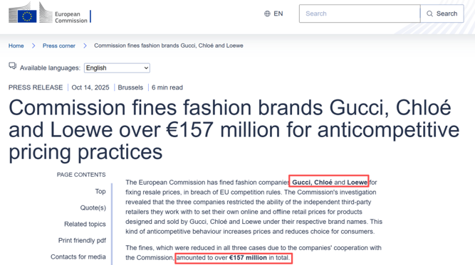 10月14日,欧盟委员会官网显示,欧盟委员会因古驰(Gucci)、蔻依(Chloé)和罗意威(Loewe)存在反竞争定价行为,对三家公司处以合计超1.57亿欧元罚款。