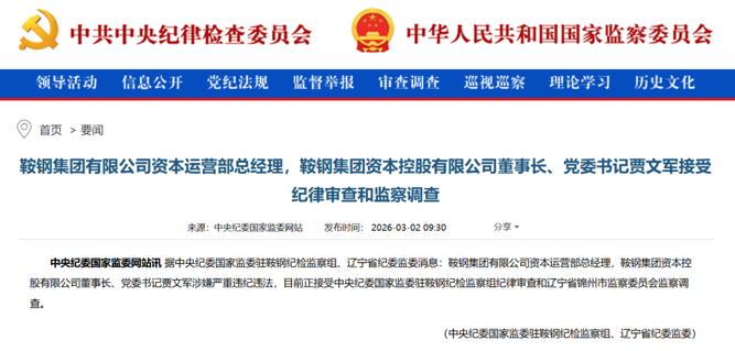 3月2日,中央纪委国家监委官网通报:鞍钢集团有限公司资本运营部总经理,鞍钢集团资本控股有限公司董事长、党委书记贾文军涉嫌严重违纪违法,目前正接受中央纪委国家监委驻鞍钢纪检监察组纪律审查和辽宁省锦州市监察委员会监察调查。