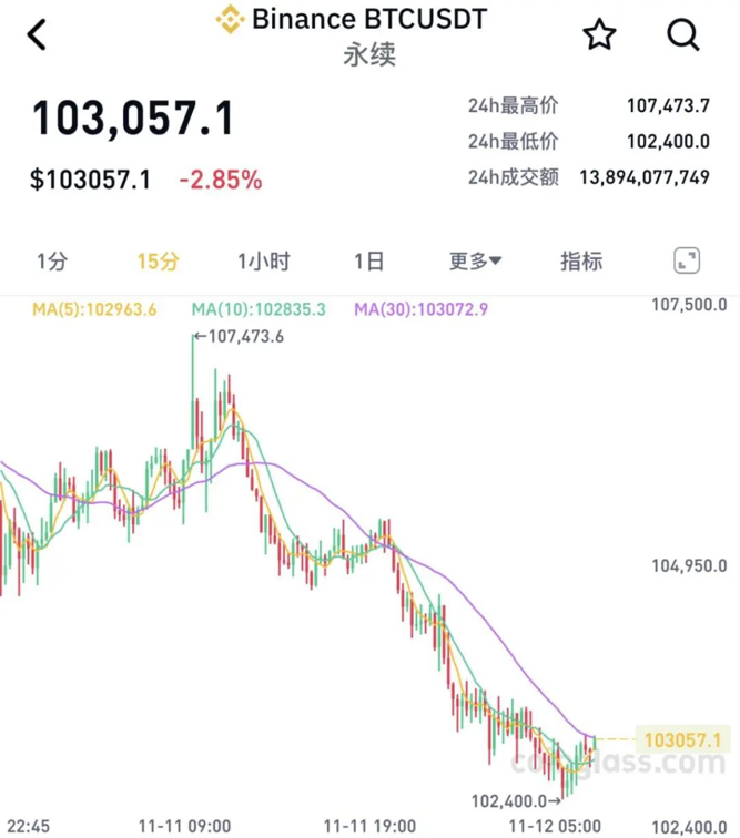 11月12日凌晨,比特币跌破103000美元/枚,日内跌近3%。此前,比特币价格曾一度失守10万美元关口,随后震荡拉升。