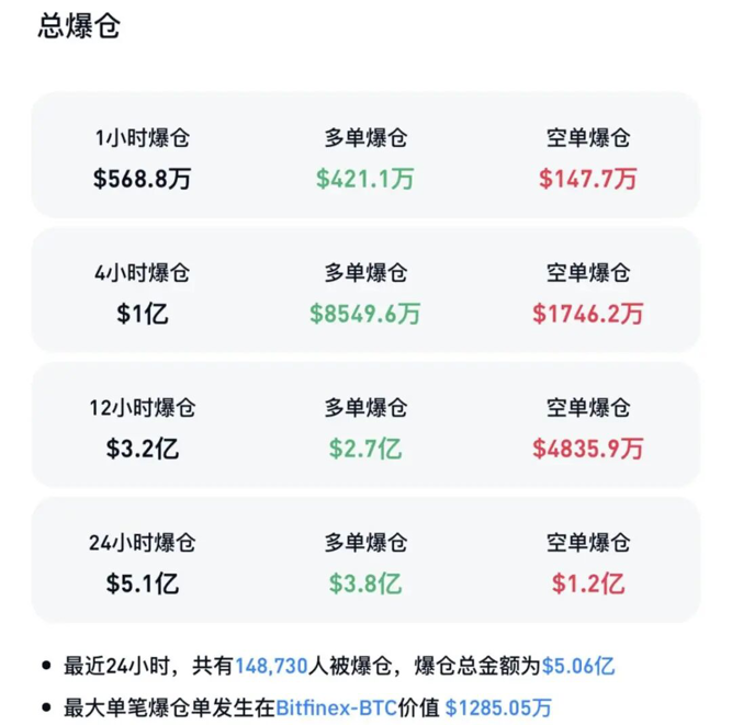 Coinglass数据显示,过去24小时加密货币市场共有近15万人被爆仓,爆仓总金额为5.06亿美元,其中多单爆仓3.8亿美元,空单爆仓1.2亿美元。最大单笔爆仓发生在Bitfinex-BTC。