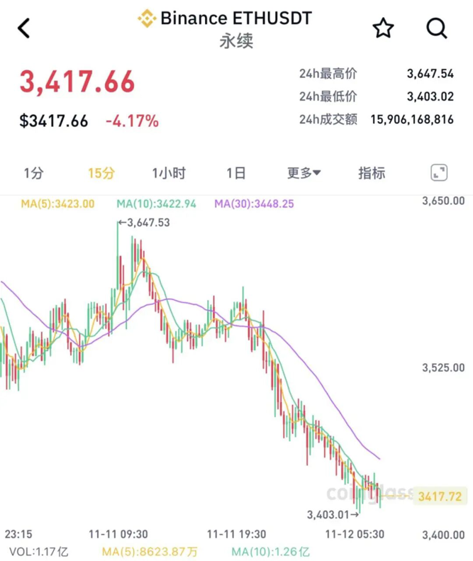 以太坊同样走低,今日凌晨跌破3410美元/枚,日内跌超4%。