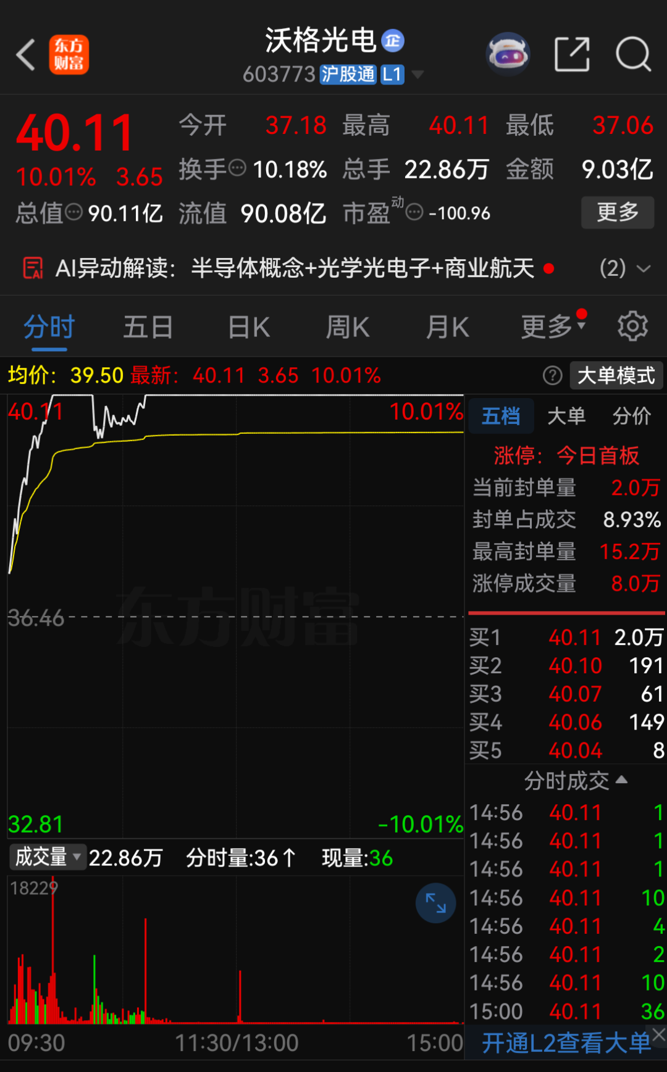 2月3日收盘,沃格光电股价报40.11元/股,涨幅达10%,总市值为90.11亿元。