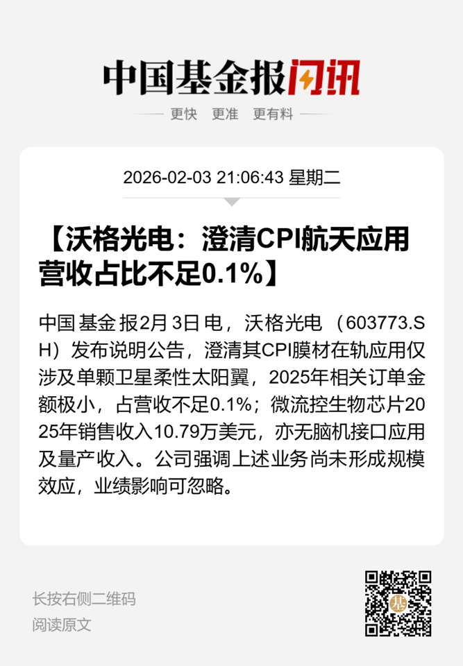 2月3日晚间,沃格光电公告称,公司航天CPI产品尚未量产,前述在轨应用仅涉及单颗卫星柔性太阳翼,订单金额较小。